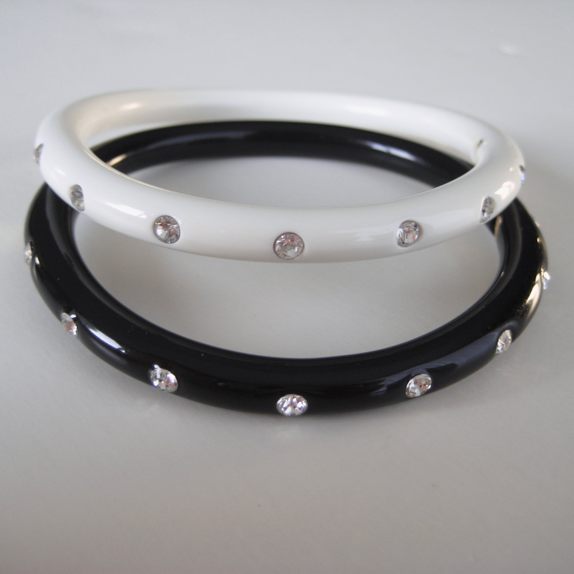 Rare runway energy straight from the late 90s/early 2000s. High-shine black and white resin bangles, each detailed with embedded crystals and gold “CHANEL” lettering.