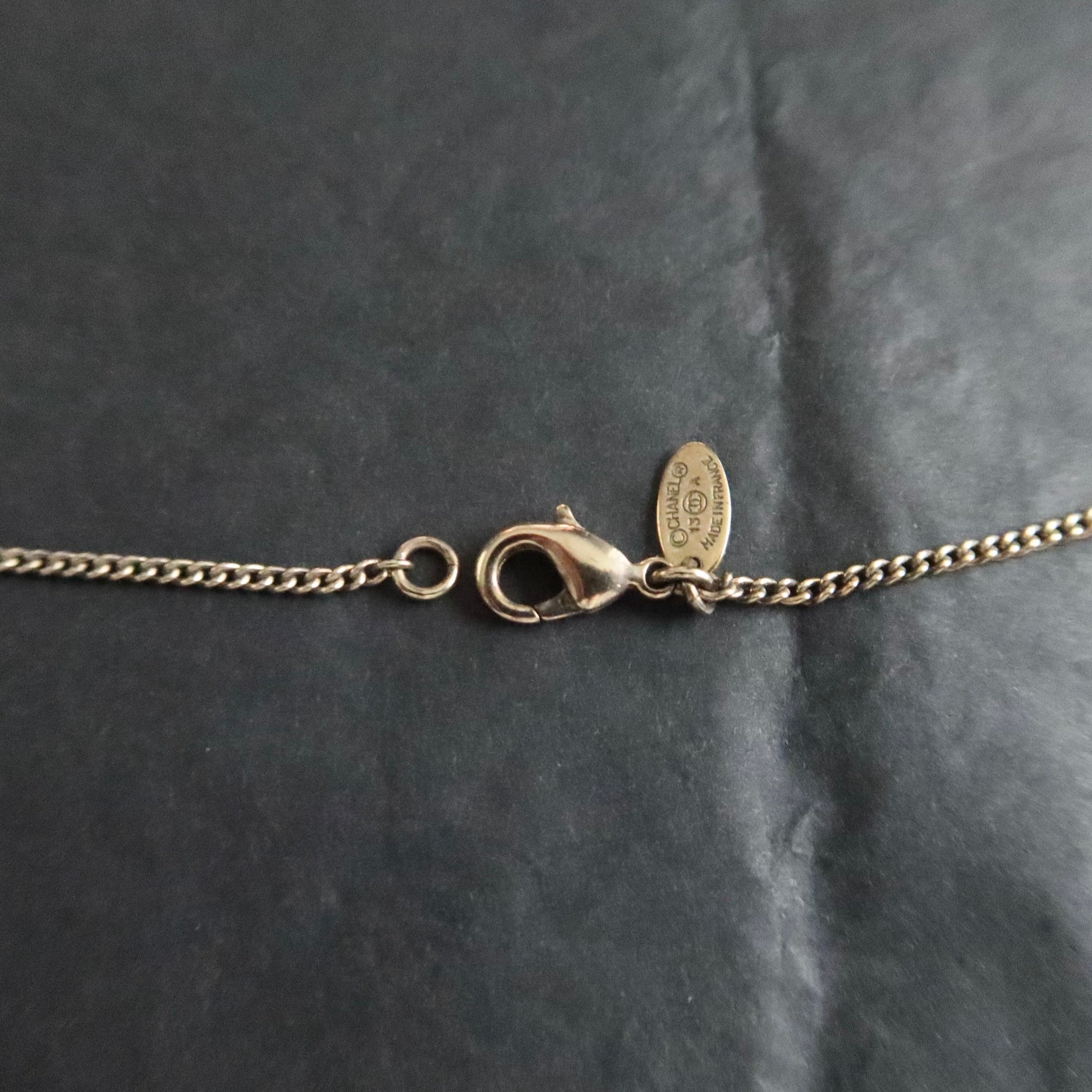 Chanel CC pendant necklace with a white enamel finish and a small gold-tone flower detail. 11A = Fall 2011 collection as stamped on the hallmark. Made in France. Gold-tone snake chain with lobster clasp and oval Chanel hallmark tag. Visible vintage wear on the back of the pendant. Front clean.
