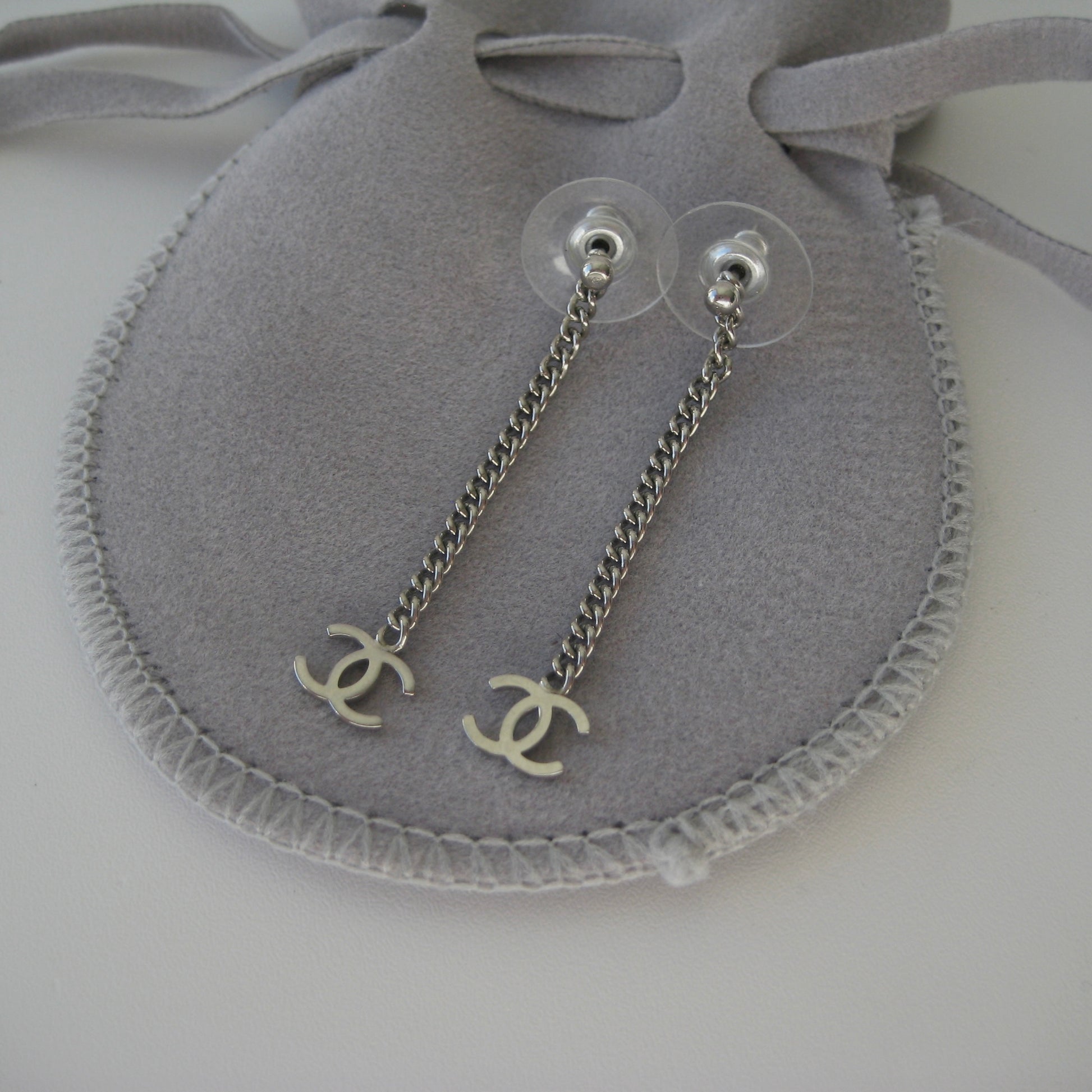 Silver-tone metal, elongated chain, CC logo terminal, post-back fastening.