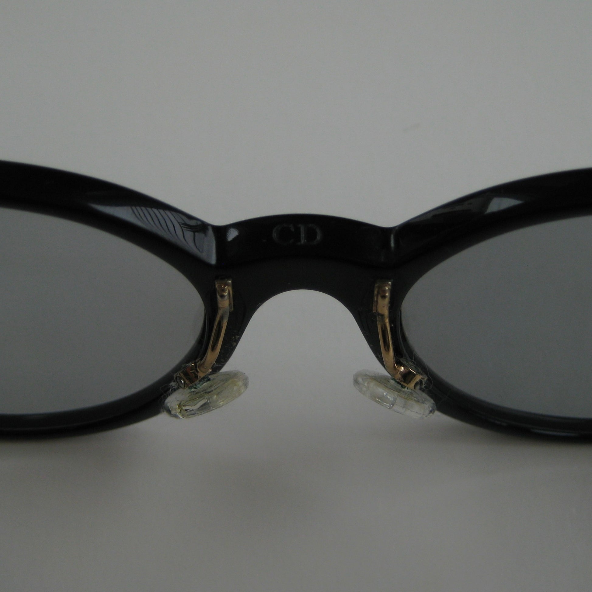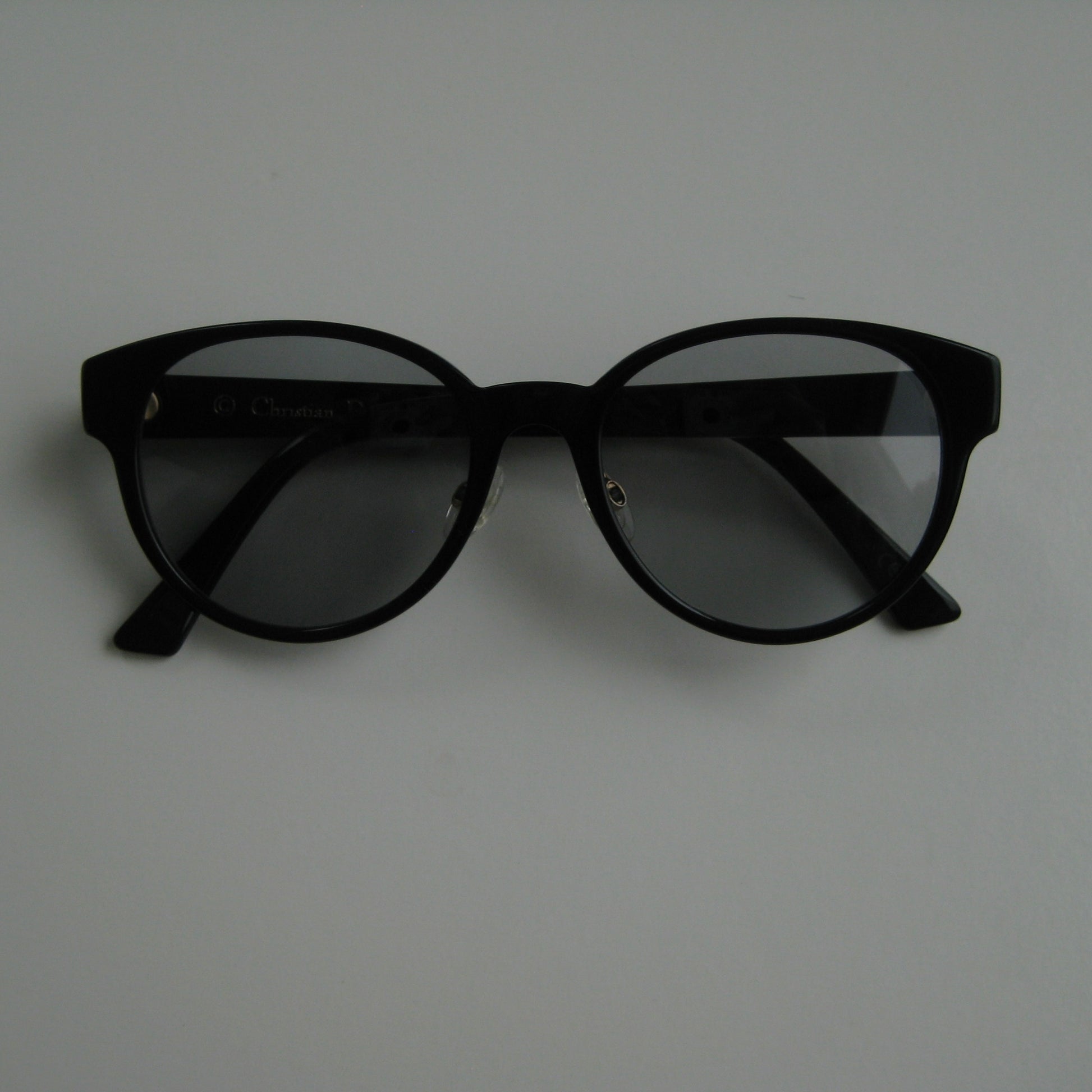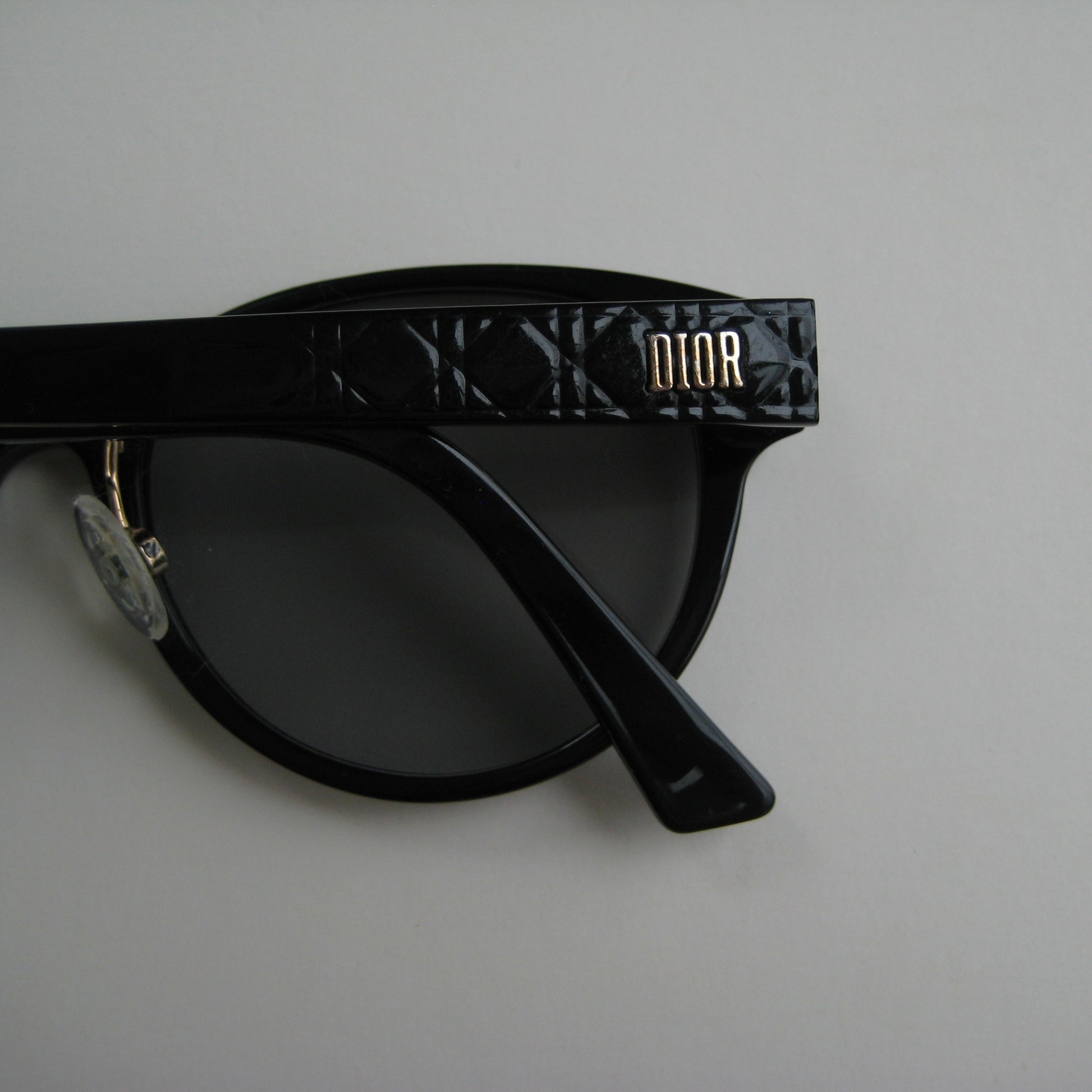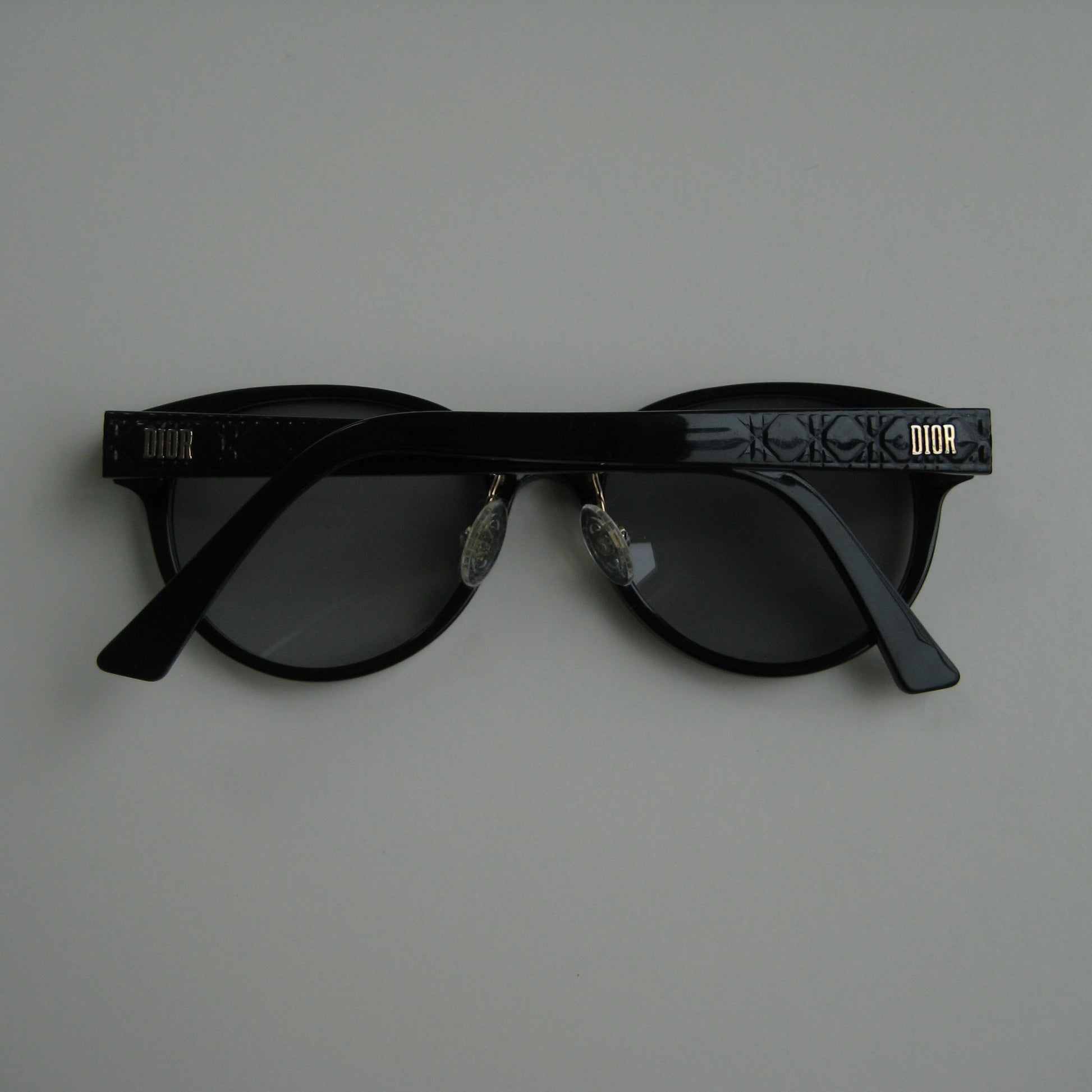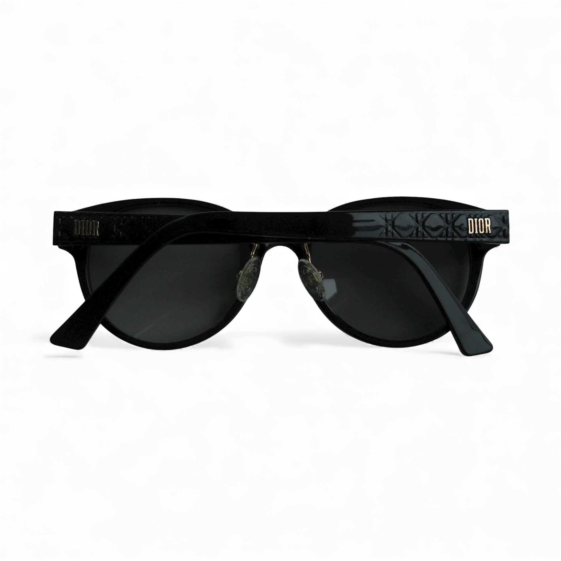 Archival Christian Dior sunglasses from the early 1980s. Gloss black acetate frame with rounded silhouette. Temples feature embossed Dior Oblique motif and gold DIOR logo plaque. Grey gradient CR39 lenses. Adjustable nose pads with engraved Dior detail.