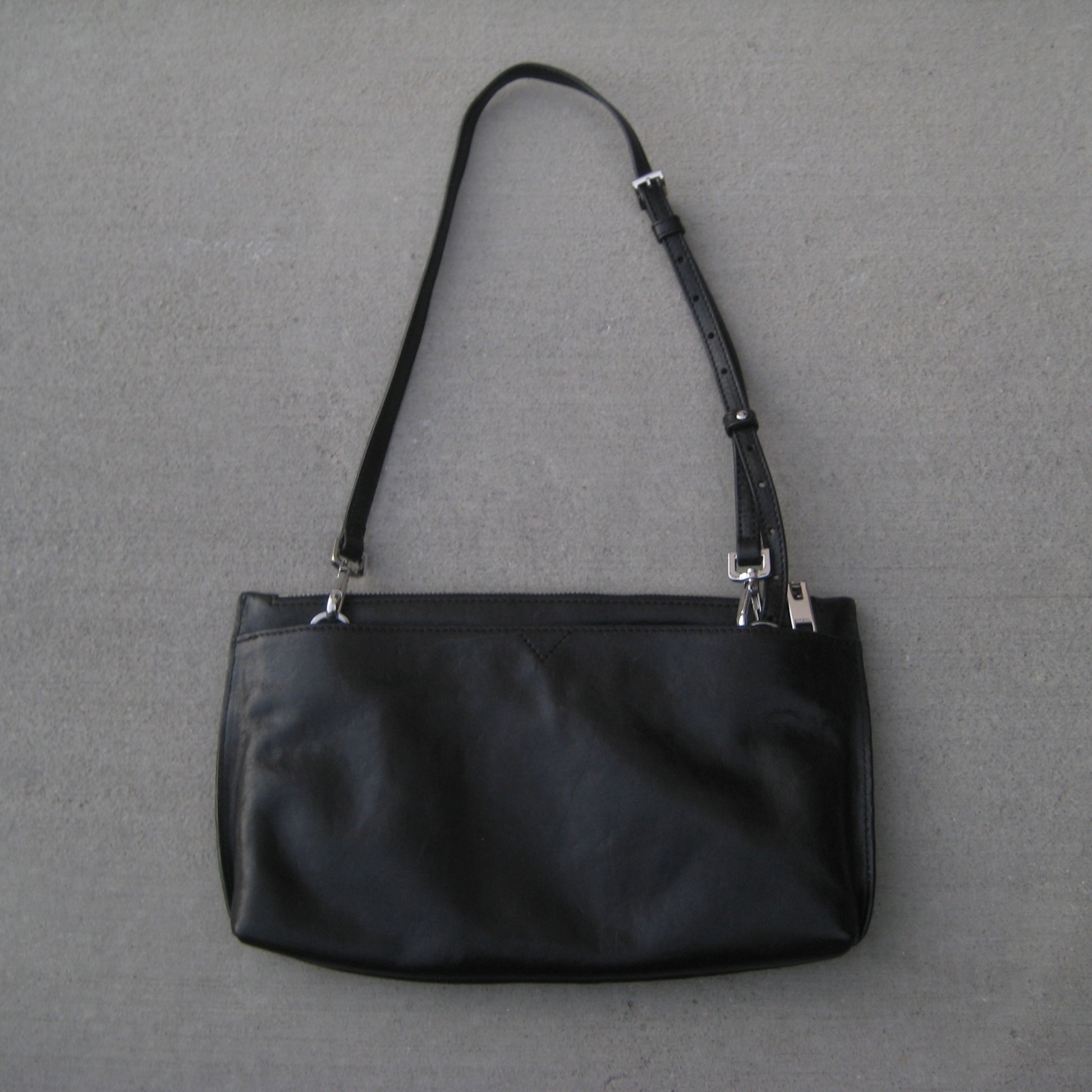 Adjustable strap, silver hardware, and spacious lined interior with inner pocket.