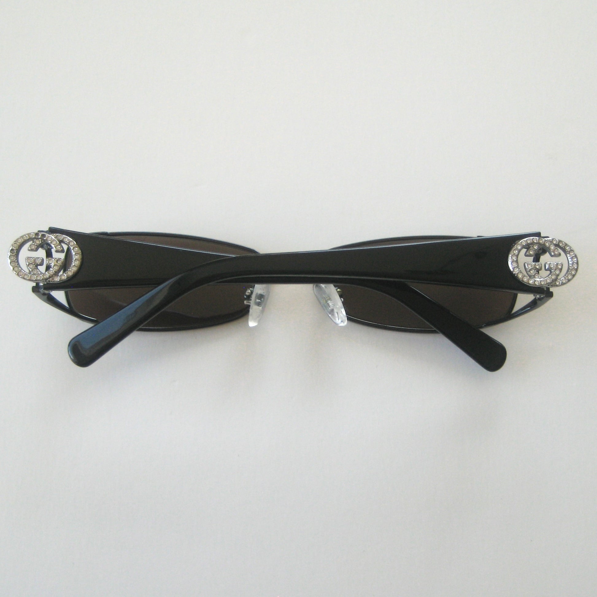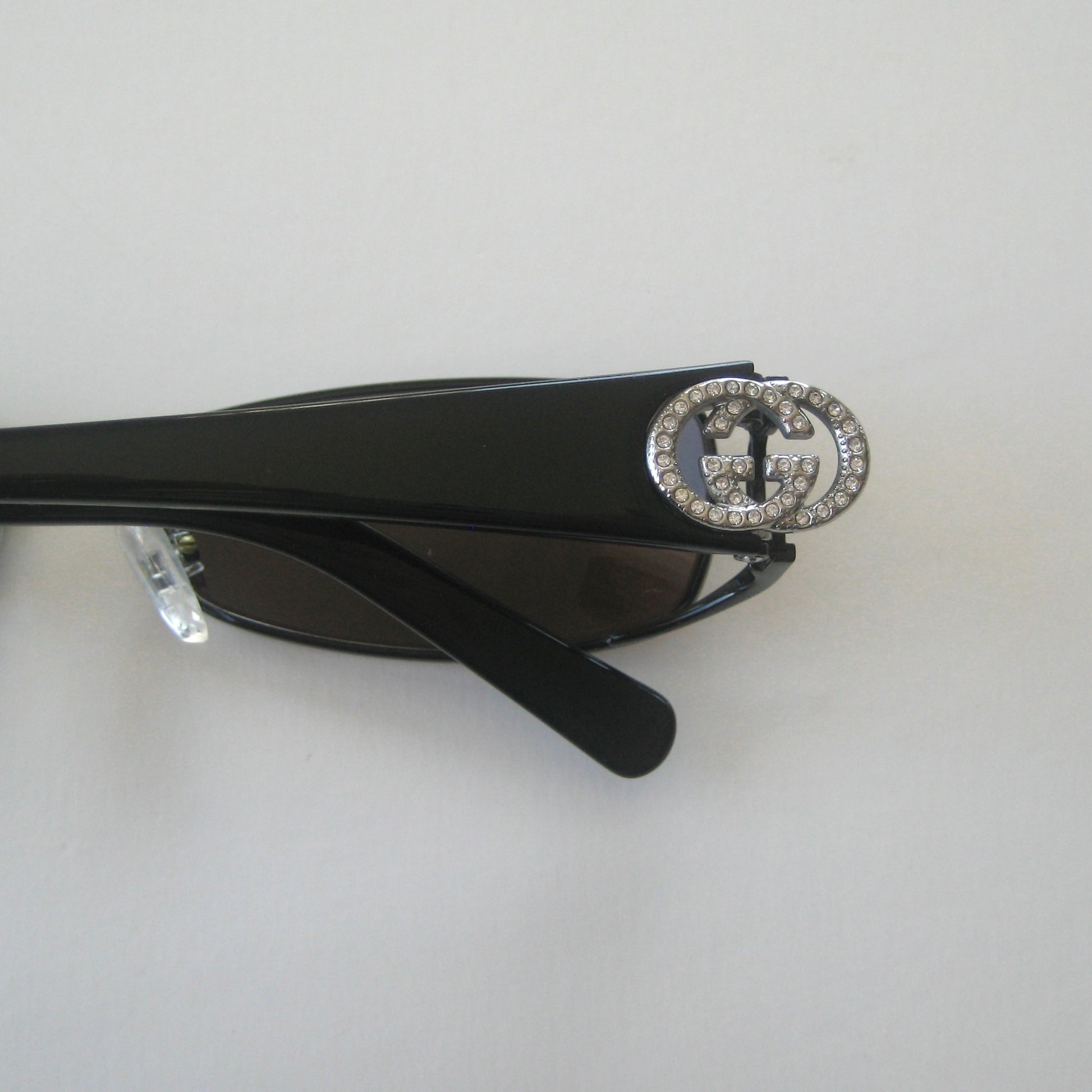 black acetate, rhinestone logo, rectangular sunglasses, smoke tint, vintage Gucci, Y2K fashion, collectible eyewear, Italian craftsmanship, crystal hardware, archive style