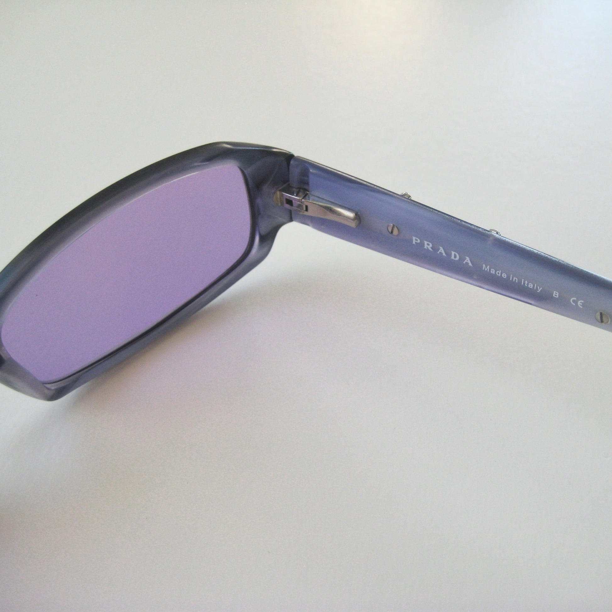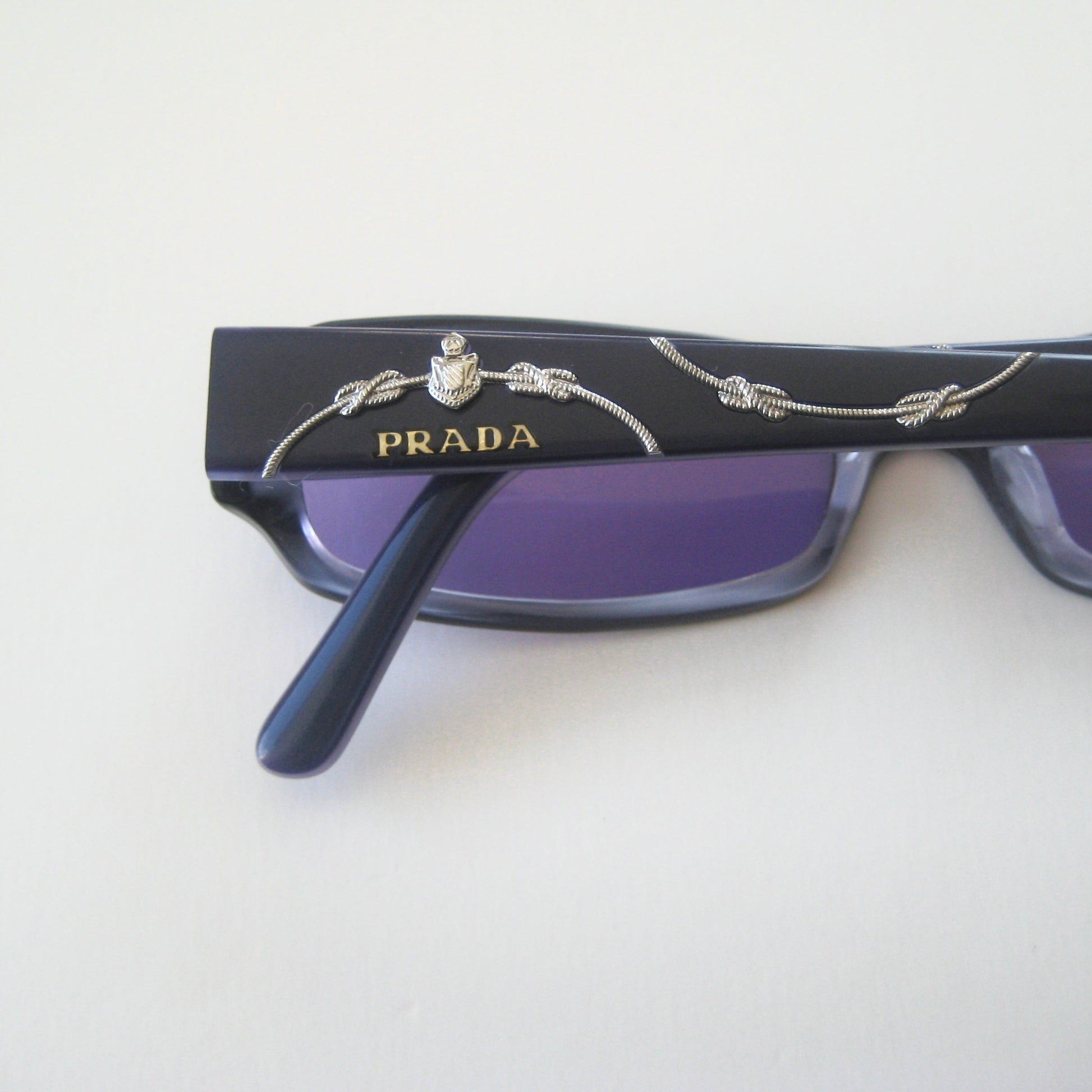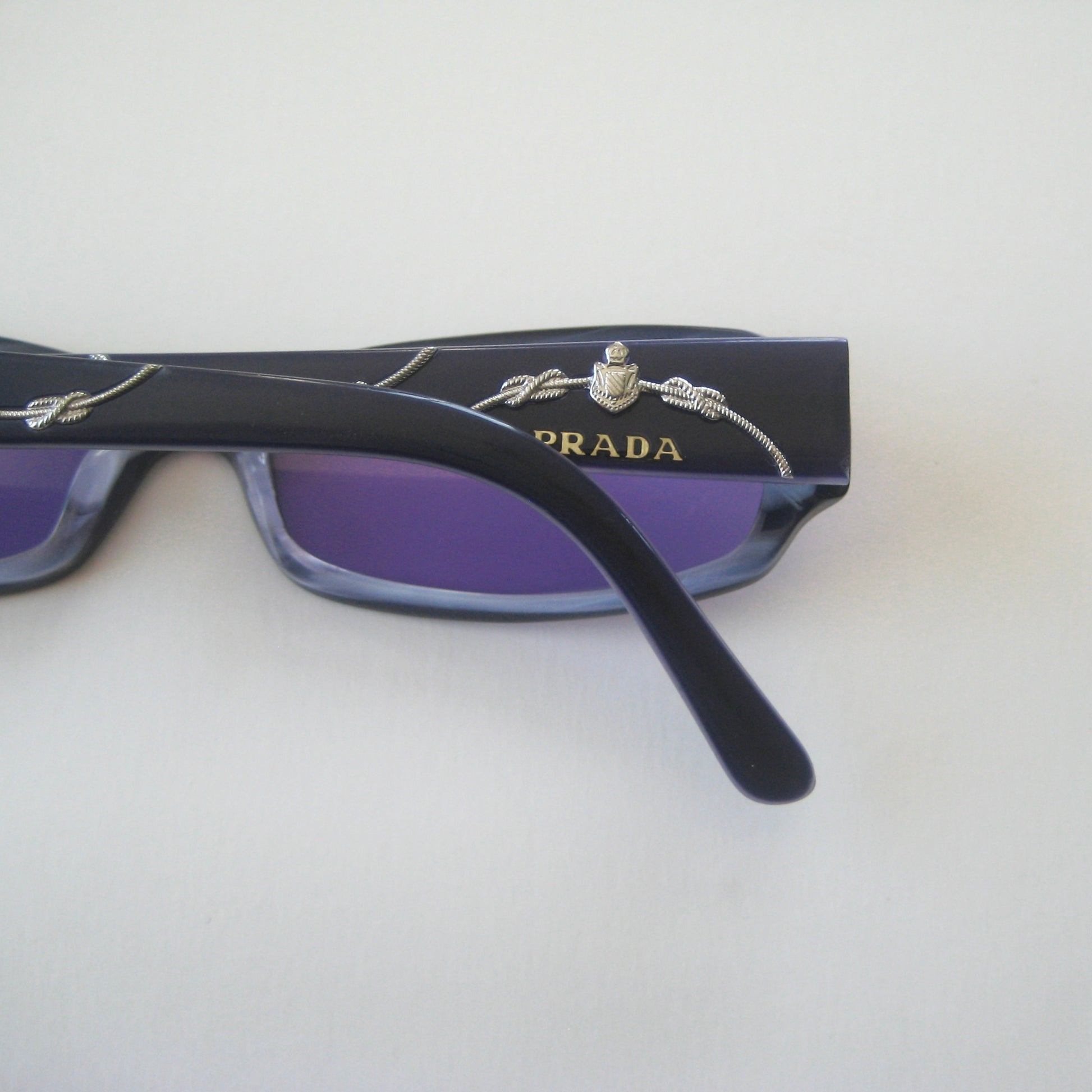 violet lenses, translucent blue, Y2K style, Prada sunglasses, collectible eyewear, bold accessory, vintage inspired, silver vines, gold logo, rare design