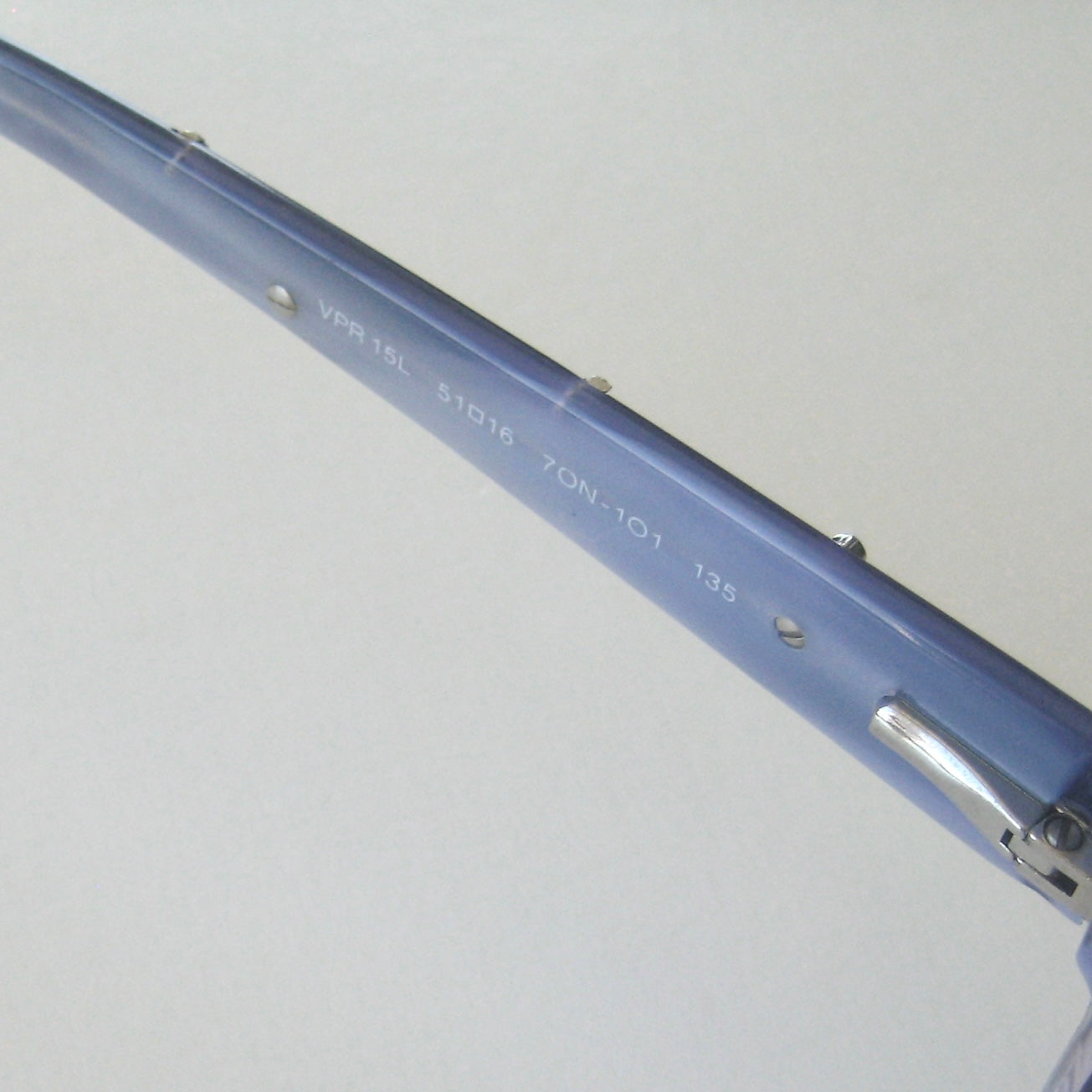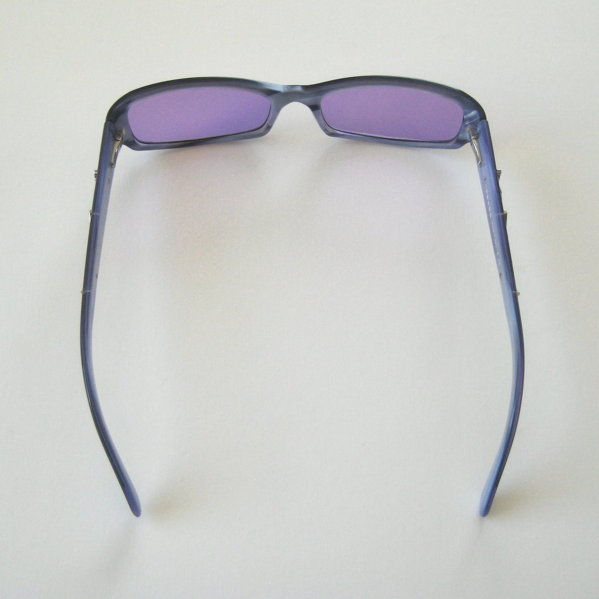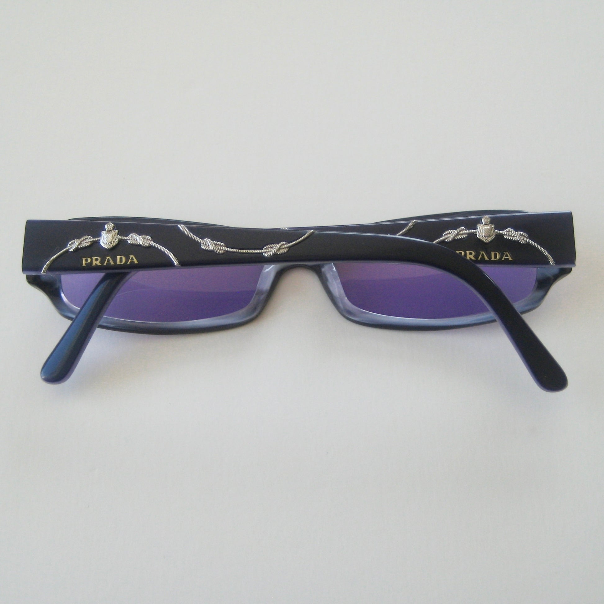 violet lenses, translucent blue, Y2K style, Prada sunglasses, collectible eyewear, bold accessory, vintage inspired, silver vines, gold logo, rare design