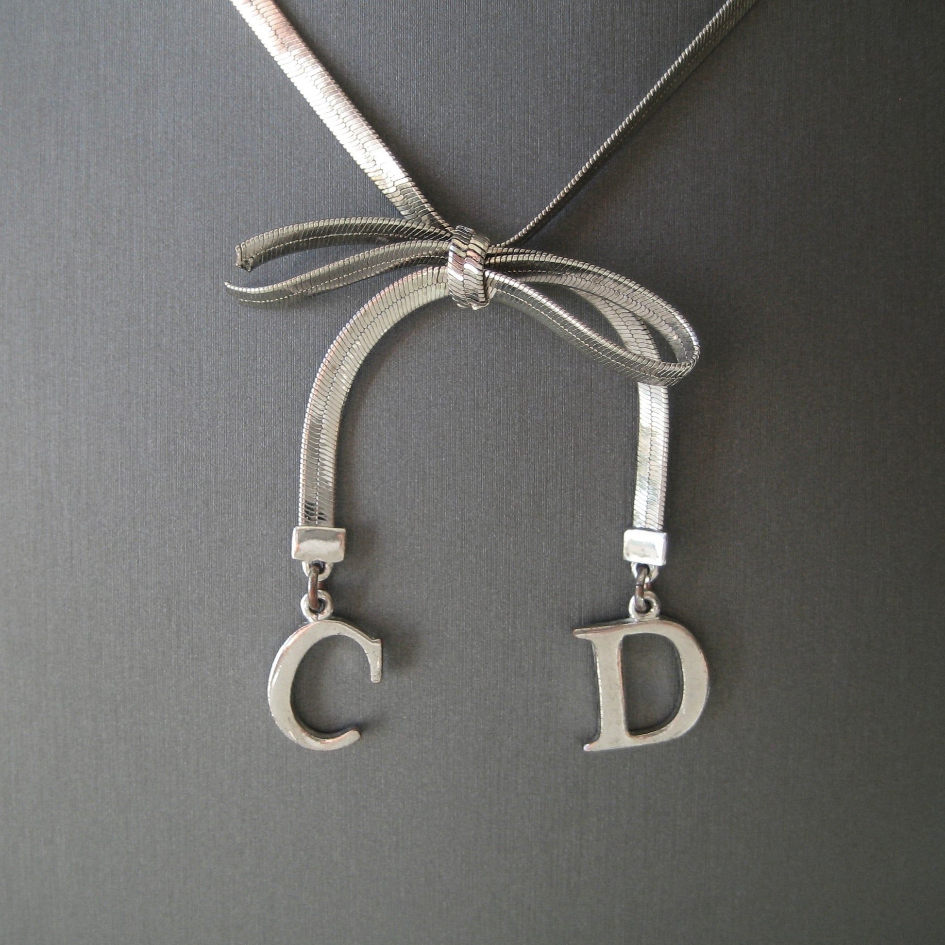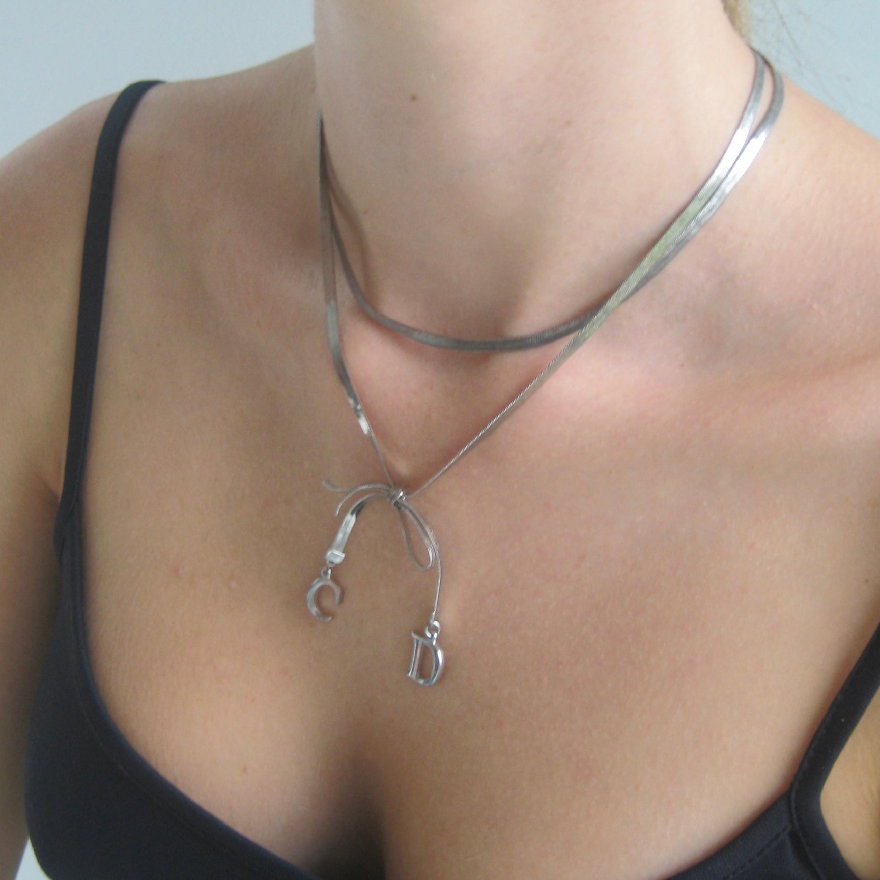 Silver metallic ribbon choker with signature “C” and “D” charms.